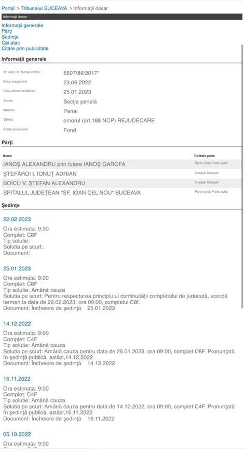 Dosarul revine pe rolul Tribunalului Suceava în luna iunie 2022, iar de atunci judecătorii o țin într-o amânare. De patru ori s-au întâlnit judecătorii în ședință publică, în acest dosar penal, dar de fiecare dată totul s-a terminat cu o amânare.