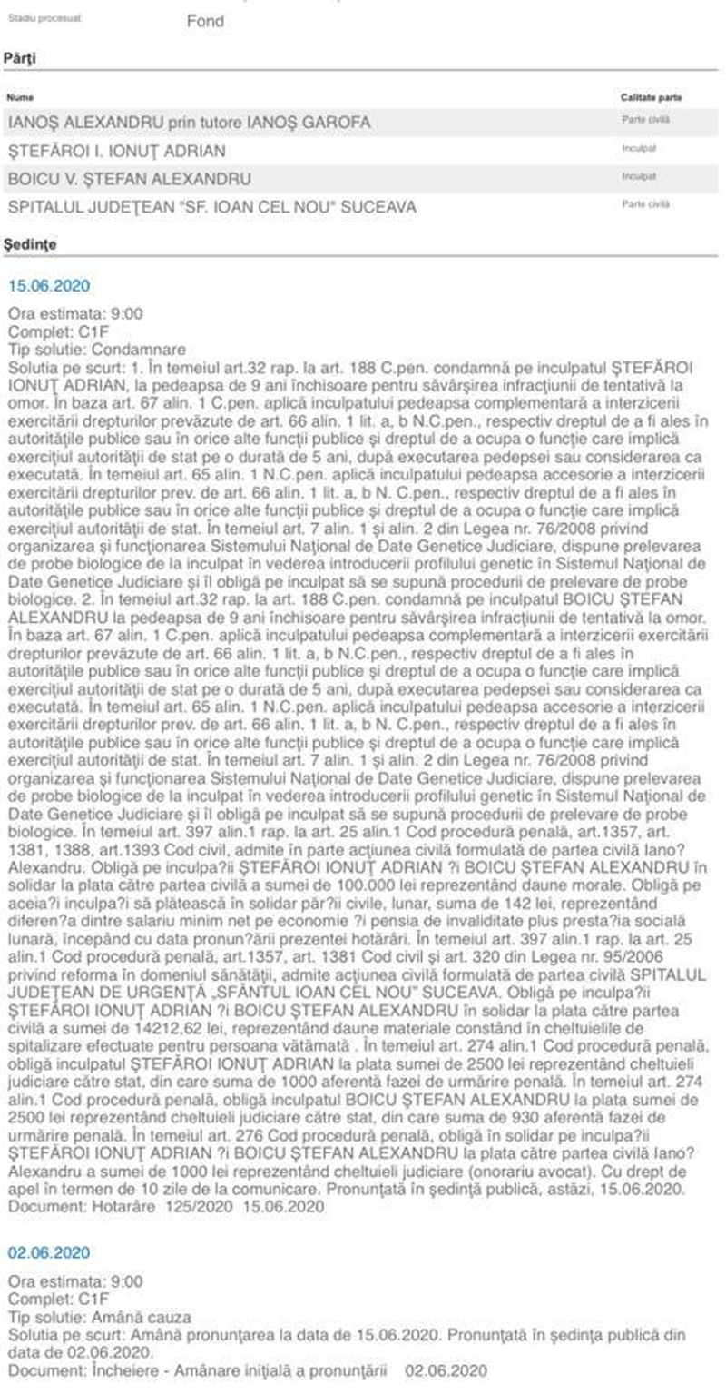 Făptașii, cei doi, au fost trimiși în judecată pentru tentativă de omor iar judecată pe fond, la Tribunalul Suceava, se termina în 2020, pe 15 iulie, în plină pandemie. Ambii inculpați primesc câte nouă ani de închisoare cu executare, interzicerea unor drepturi și plata unor daune de 100.000 de lei pentru victimă.