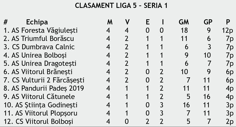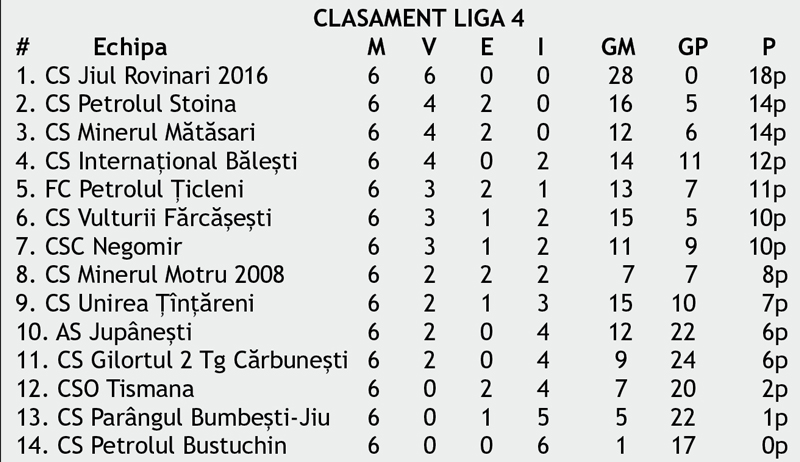 Jiul Rovinari își continuă parcursul perfect din Liga a patra. Trupa condusă de Ion Lițoiu are 18 puncte din primele șase etape după succesul cu Internațional Băleșți. Petrolul Stoina și Minerul Mătăsari sunt celelalte echipe neînvinse din campionat. La ,,Onoare” a plouat din nou cu goluri, singura formație care nu a marcat din cele două serii fiind Roșia de Amaradia.