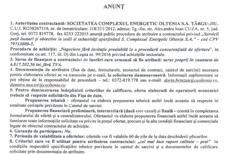 Firme din Gorj, Dolj, Mehedinți și Ialomița vor asigura paza la Complexul Energetic Oltenia. Contractul are o valoare de peste 6 milioane de lei și a fost încredințat fără licitație, prin negociere fără invitație prealabilă la o procedură concurențială de ofertare.