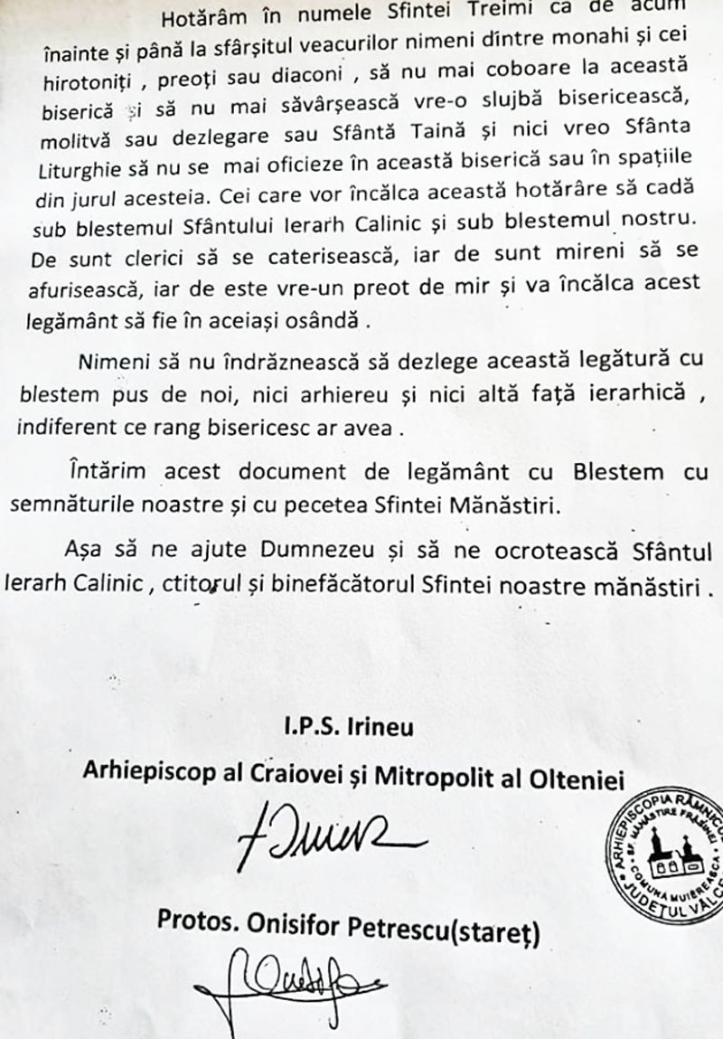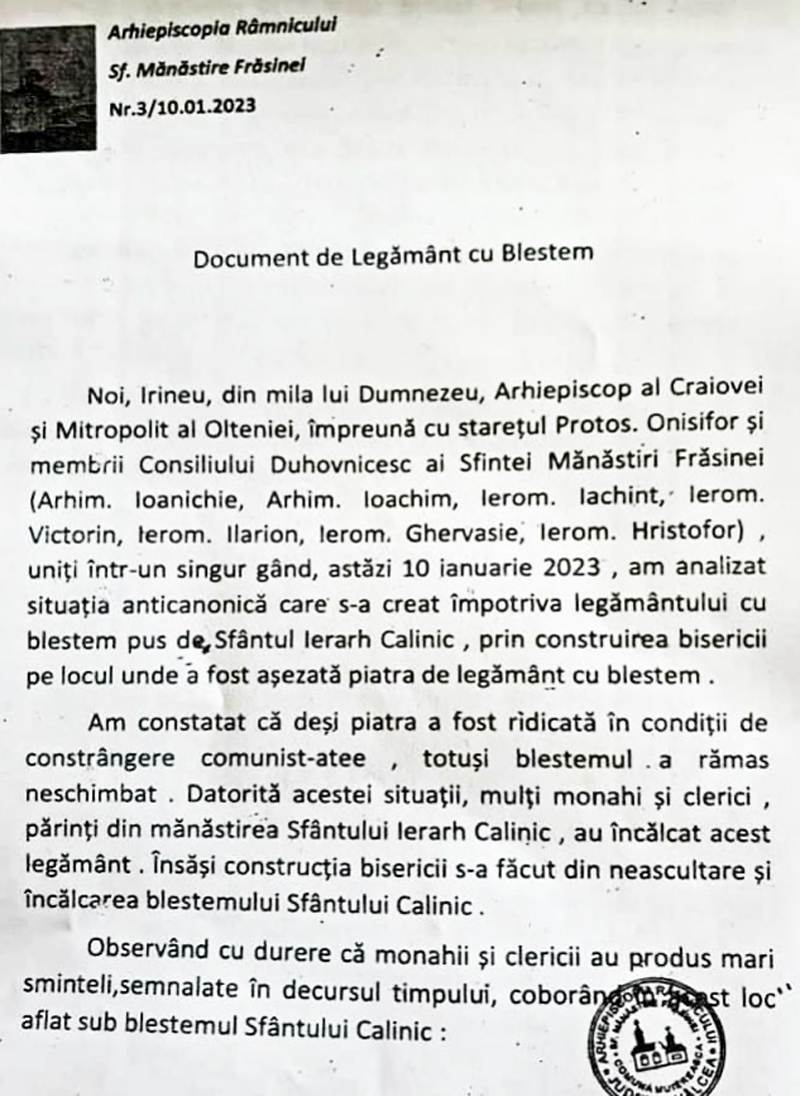 Cei care vor încălca această hotărâre să cadă sub blestemul Sfântului Ierarh Calinic și sub blestemul nostru. De sunt clerici să se caterisească, iar de sunt mireni să se afurisească, iar este de este vreun preot de Mir și va încalca acest Legământ să fie în aceeași osandă”, se arată în „Documentul de legământ cu blestem” semnat de mitropolitul Olteniei și starețul mănăstirii. Documentul este plin de greșeli gramaticale și se încheie cu mențiunea că niciun reprezentant al bisericii „să nu îndrăznească să dezlege această legătură cu blestem pus de noi”. Cei care au citit pe internet documentul l-au dezaprobat, ieri Mitropolia Olteniei fiind nevoită să vină cu precizări suplimentare, mai ales că mănăstirea Frăsinei este vizitată în special vara de un număr mare de turiști în periplul lor pe la locașurile de cult din nordul Olteniei, inclusiv cele din Gorj.