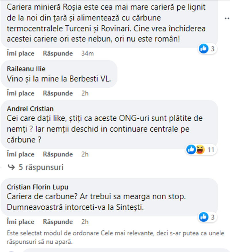 Octavian Berceanu, politician USR, fost șef al Gărzii Naționale de Mediu, pe pagina de Facebook, a făcut un ,,live” în care amenda cariera Roșia din cadrul CE Oltenia, că funcționează!. Practic, acești politicieni sunt cei cărora tot județul Gorj trebuie le ,,mulțumească” pentru disponibilizările din acest an și cele viitoare, pentru închiderea energiei pe cărbune și pentru întunericul, dacă e să-l ascultăm e fostul premier Mihai Tudose, care va veni peste România.