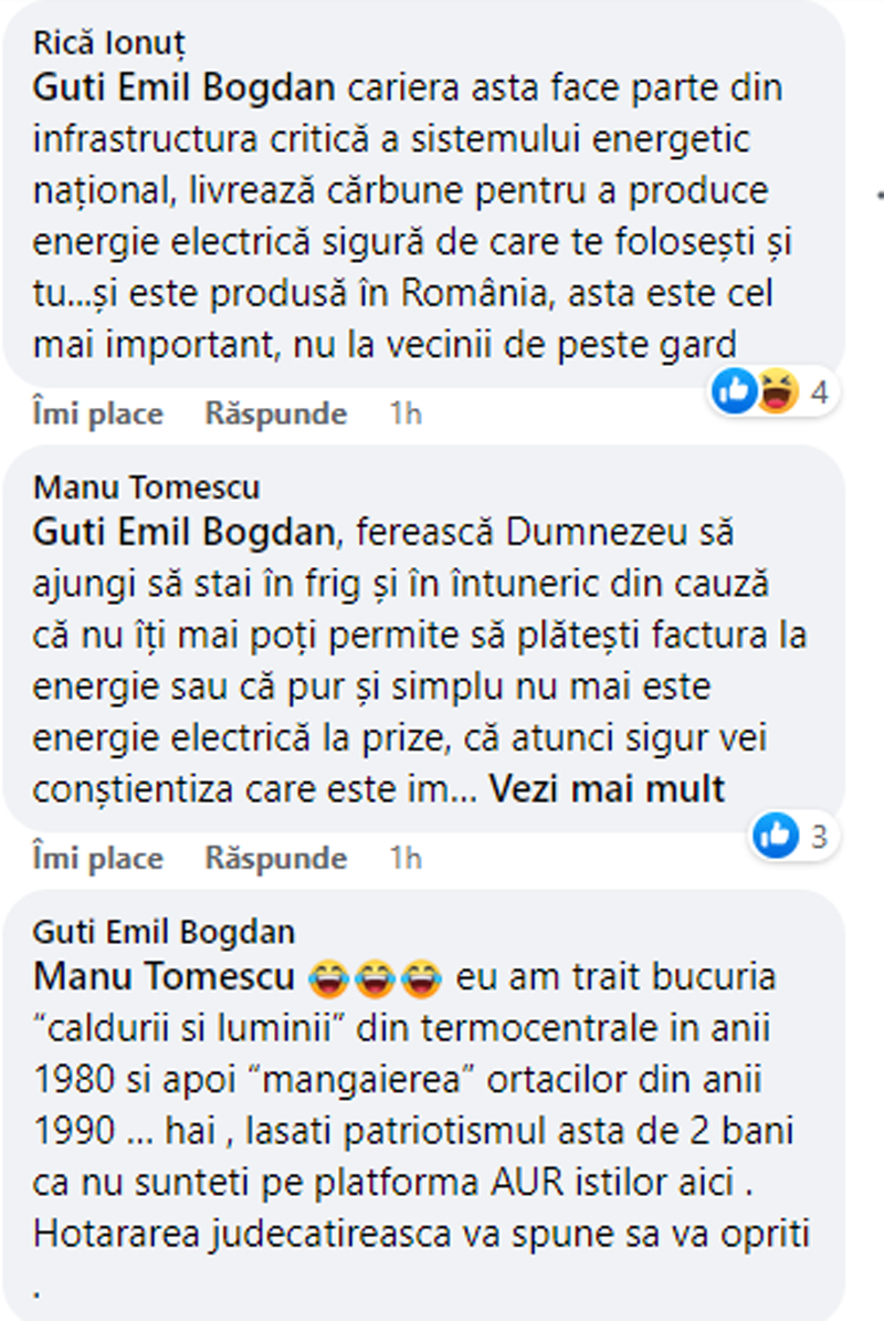 ,,Domnule, care te pretinzi a fi politician român, ar trebui să știi că acea carieră minieră scoate cărbune pentru Sistemul Energetic Național, adică pentru ca România să nu stea la mâna străinilor în ceea ce privește energia electrică! Ar trebui să anunți poliția și alte organe de control ale statului român, pentru a denunța jaful din Sistemul Energetic Național, jaf ce a făcut din România o țară care nu își mai poate susține consumul energetic național, cu propriile capacități de producție! Dacă tu ca politician român faci politică împotriva intereselor acestei națiuni, eu te consider un trădător de neam și de țară, ci nicidecum un politician român!”.
