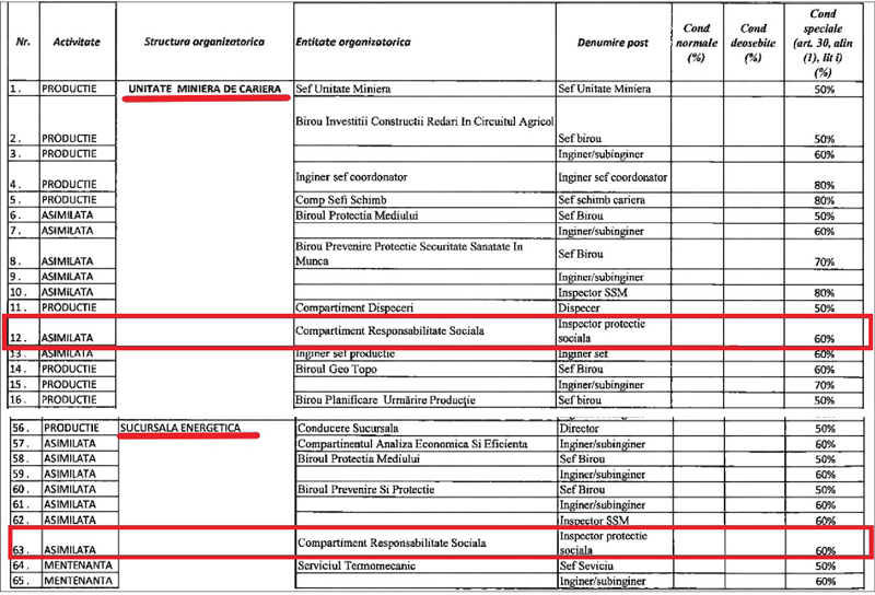 Directoratul CEO și reprezentanții federațiilor sindicale din companie au semnat, săptămâna trecută, un act adițional la Contractul Colectiv de Muncă în care au fost încadrate în condiții speciale locurile de muncă ale salariaților producătorului energetic, potrivit reglementărilor Legii 197/2021. Potrivit documentului, au fost încadrați în condiții speciale 100%, toți muncitorii din activitatea minieră, conducătorii formațiilor de lucru, precum și muncitorii din activitatea energetică, dar și cei de la ELCFU. Trebuie spus că și personalul TESA de la Unitățile Miniere de Carieră, de la Unitatea producție și reparații utilaje miniere (UPRUM), dar și din activitatea energetică și o mică parte din executivul CEO va beneficia de condiții speciale, proporțional cu locul de muncă, între 50 și 80%. Surpriza, în anexele actului adițional, o constituie inspectorii sociali, adică locurile special create, în trecut, pentru liderii sindicali. Administrația CEO a găsit o soluție ca și aceștia să beneficieze de condiții speciale: atât la unitățile miniere de carieră, cât și la sucursalele energetice apar structurile denumite Compartiment Responsabilitate Socială, cu posturile aferente de inspectori protecție socială. Concret, un lider de sindicat, angajat în postul de inspector social, va beneficia de condiții speciale 60%, mai mult decât un șef de carieră, care are 50% condiții speciale.