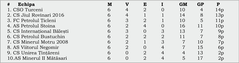 CSO Turceni este noul lider din Liga a patra după runda cu numărul şase de la judeţ. Jiul Rovinari a suferit prima înfrângere a sezonului, la Stoina, şi astfel a cedat primul loc.