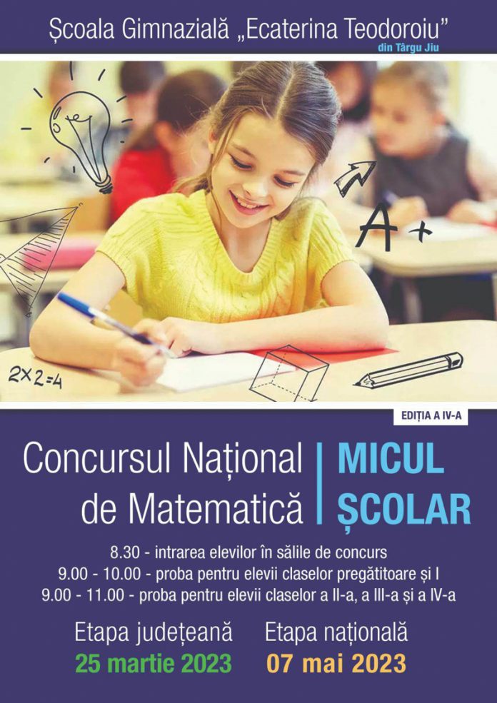 La Școala Gimnazială „Ecaterina Teodoroiu” din Târgu-Jiu a avut loc, recent, etapa județeană a celei de-a IV-a ediții a Concursului Național de Matematică „Micul școlar”, la care au participat 334 de elevi din tot județul.