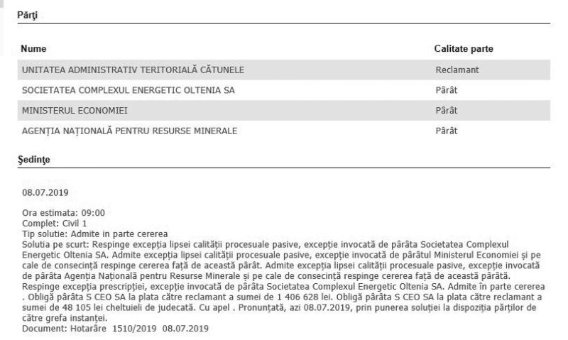 Complexul Energetic Oltenia este bun de plată, după ce instanța a decis că o unitate de învățământ din comuna gorjeană Cătunele a avut de suferit de pe urma activităților miniere. Școala din Valea Mînăstirii prezintă multiple fisuri în pereți și elevație, o expertiză tehnică geologică arătând negru pe alb că degradările aduse imobilului se datorează lucrărilor miniere, de suprafață și subteran, efectuate în zonă. Ca atare, Complexul Energetic Oltenia a fost obligat la plata sumei de 1,4 milioane lei. Peste 100 de elevi învață la această școală, spune primarul Florinel Țuilă.