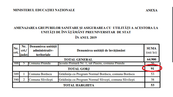 Paradoxal, pe lista aprobată de Guvern se găsesc doar două unităţi şcolare din judeţ. Este vorba de grădiniţele cu program normal din comunele Borăscu şi Slivileşti, care vor primi în total suma de 91 de mii de lei. În urmă cu un an, pe 24 ianuarie 2018, fostul ministru Liviu Marian Pop publica o listă cu şcolile care au toaletă în curte. Numărul acestora era de 2.418, dintre care 28 de şcoli din Gorj aşteptau să intre „în rândul lumii”. Acum se vorbeşte ca lângă şcoli să fie amplasate containere speciale în care vor funcţiona toalete moderne.