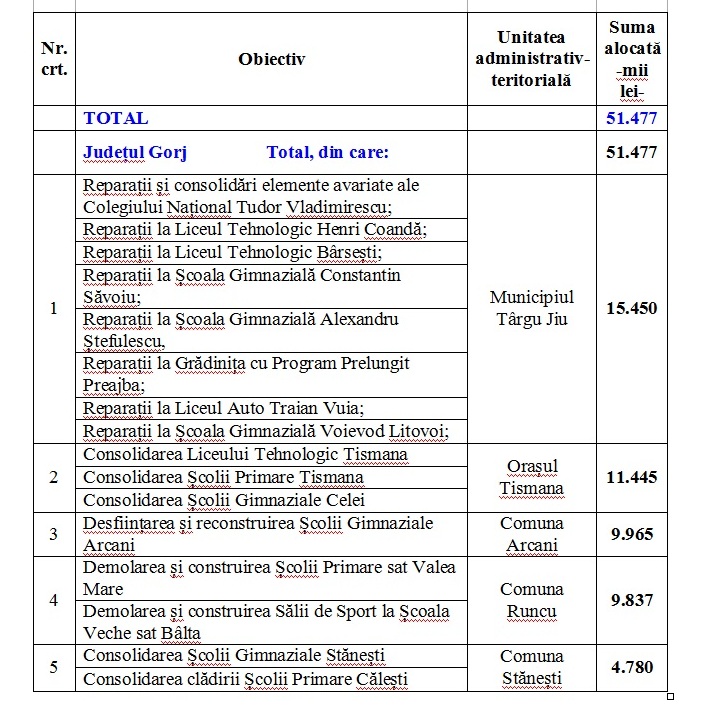 De acest sprijin vor beneficia Municipiul Târgu Jiu, Orașul Tismana și comunele Arcani, Runcu și Stănești, pentru reabilitarea, consolidarea și reconstruirea a 16 obiective, dintre care: 9 școli, 5 licee, o grădiniță și o sală de sport.