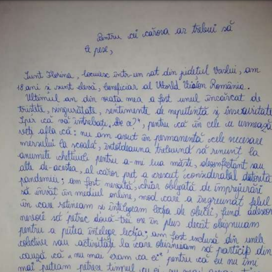 Scrisorile scrise de mână de copiii din World Vision România pot fi citite aici: https://worldvision.ro/wp-content/uploads/2021/06/Scrisorile-copiilor-din-mediul-rural-4.pdf.