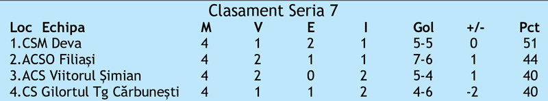 Gilortul Târgu Cărbunești nu renunță la barajul de promovare în liga secundă. Trupa gorjeană a obținut cea dintâi victorie din play-off-ul Seriei 7, 3-2 cu ACSO Filiași. Au fost nevoie de patru meciuri pentru primul succes al elevilor lui Mario Găman și Bobi Staicu din această fază. Gazdele au făcut ce au vrut în prima repriză a jocului de pe ,,Cristinel Răducan”. O ,,dublă” a lui Săulescu și un penalti transformat de Costi Roncea păreau că au stabilit soarta punctelor după nici o jumătate de oră. Gorjenii s-au văzut ,,cu sacii-n căruță” prea devreme, iar trupa lui Victor Naicu a revenit în meci în numai 7 minute. Calu și Baidoo au dat două goluri în startul părții secunde, iar vizitatorii au căutat cu disperare egalarea. Din fericire, s-au lovit și de intervențiile providențiale ale lui Oprița, care s-a asigurat că punctele rămân la Târgu Cărbunești. Ultima ocazie a meciului a fost irosită de Ciutică, al cărui balon a fost respins de pe linia porții de Calu. Succesul i-a dus pe amfitrioni la patru puncte de locul doi, ocupat chiar de doljeni. În aceeași serie, Deva a suferit prima înfrângere a sezonului, fiind depășită de Viitorul Şimian. Mehedințenii vin pe 28 aprilie la Cărbunești, pentru meciul din etapa a 5-a.