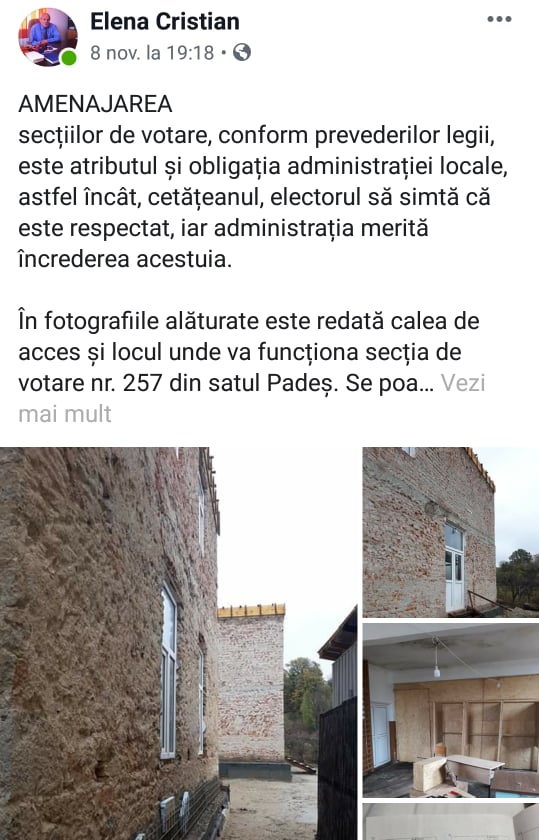 ,,Amenajarea secțiilor de votare, conform prevederilor legii, este atributul și obligația administrației locale, astfel încât, cetățeanul, electorul să simtă că este respectat, iar administrația merită încrederea acestuia. În fotografiile alăturate este redată calea de acces și locul unde va funcționa secția de votare nr. 257 din satul Padeș. Se poate observa că această secție este în aceeași locație, doar că, condițiile de funcționare sunt improprii și în neconcordanță cu cerințele legii. Față de aceste aspecte, din timp, personal am informat pe primarul Serafim Antonie, lucru certificat în unul din procesele verbale de ședință al consiliului local, având în vedere că locația este într-un haos de șantier, să schimbe în termen legal locul de funcționare al acestei secții de votare, pentru că, după cum puteți constata și dumneavoastră stimați cetățeni, Școala Gimnazială Padeș, ca urmare a dezinteresului manifestat de această administrație, este într-un continuu șantier, și, mai ales că, urmează un an electoral foarte important pentru soarta țării și a comunei noastre”, a postat consilierul PMP, Cristian Elena, pe 8 noiembrie.
