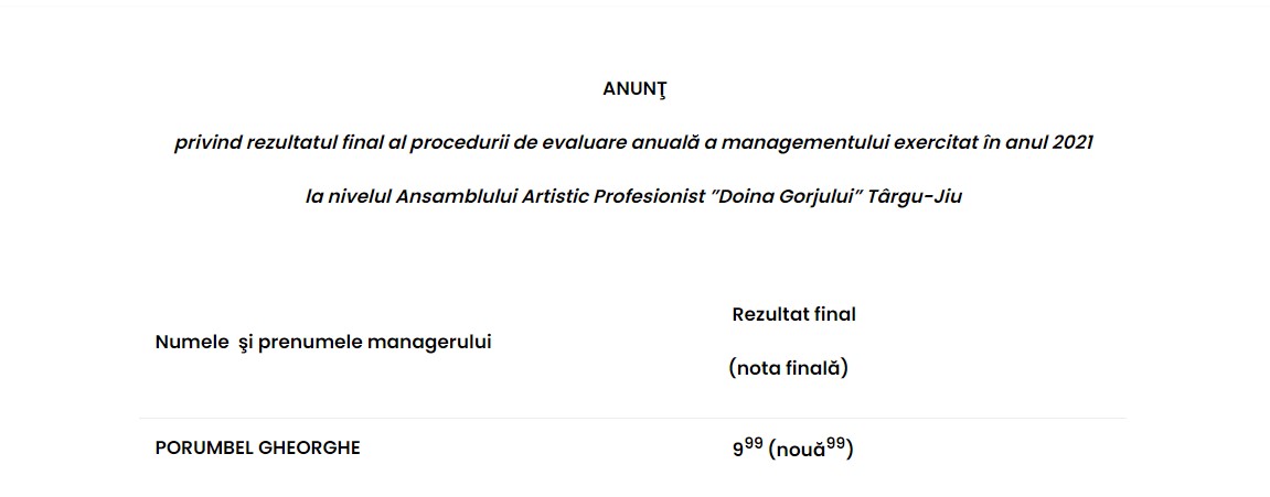 Șefii instituțiilor de cultură din subordinea Consiliului Județean Gorj au intrat în febra evaluărilor. Primii doi directori evaluați s-au apropiat de nota maximă 10. Este vorba de managerul Ansamblului Artistic Profesionist „Doina Gorjului” și de cel al Școlii Populare de Arte din Târgu-Jiu.