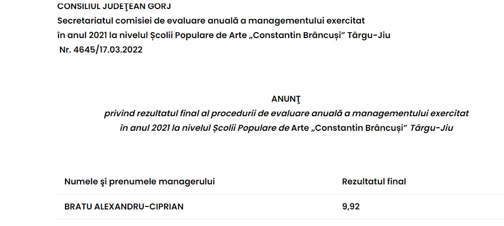 Astfel, directorul Gheorghe Porumbel a fost notat cu 9,99, iar Alexandru Bratu a obținut nota 9,92. Pentru că și-au îndeplinit obiectivele asumate în planul de management, cei doi directori își pot continua activitatea în fruntea instituțiilor de cultură.