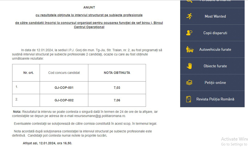 Doi candidați au participat la concursul organizat săptămâna trecută de Inspectoratul de Poliție Județean Gorj pentru ocuparea postului de șef al Centrului Operațional. Ambii au trecut de interviul structurat pe subiecte profesionale, având note apropiate, puțin peste 7, pragul minim de promovare. Astfel, candidatul cu nota 7,06 va conduce, îndruma şi coordona activitatea la nivelul inspectoratului pe linie de personal de serviciu şi dispecerat, planificare şi monitorizare misiuni, apeluri de urgență 112, monitorizare electronică, situații de criză în domeniul ordinii publice şi situații de urgență. Totodată, noul șef va desfășura și activități de planificare şi monitorizare a misiunilor de ordine şi siguranță publică, precum şi în domeniul managementului situațiilor de urgență și va asigura continuitatea conducerii Serviciului Cabinet, în lipsa șefului de serviciu.