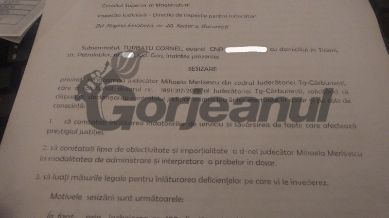 Șefa Judecătoriei Târgu-Cărbunești, reclamată la CSM pentru lipsă de obiectivitate și imparțialitate în soluționarea unui dosar penal!
