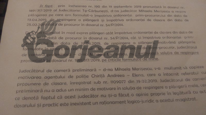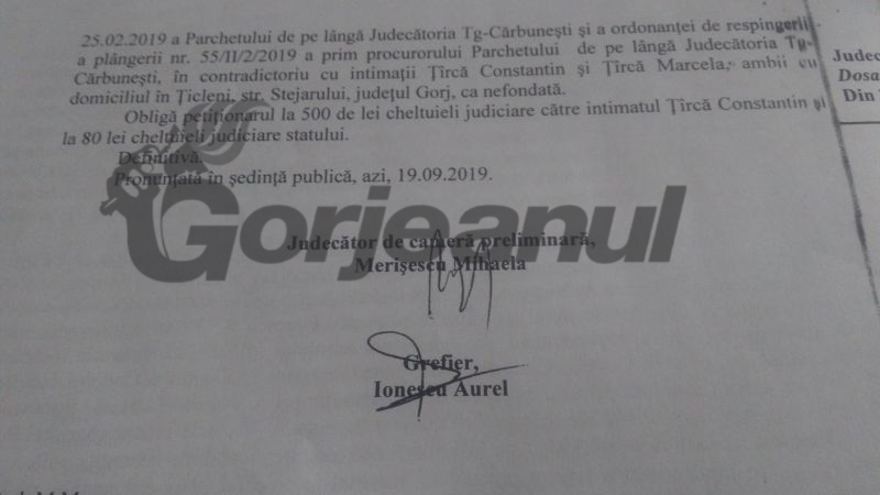 Pentru prima dată, o instanță a Judecătoriei Târgu-Cărbunești decide în septembrie, judecător fiind Merișescu Mihaela, că dosarul trebuie să rămână închis pentru totdeauna, asta după ce timp de 5 ani este plimbat de la Parchet la Judecătorie și retur.