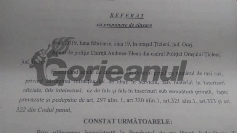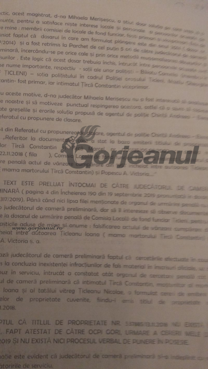 Un cetățean din Țicleni s-a adresat la finalul lunii trecute Consiliului Superior al Magistraturii, după ce judecătorul Mihaela Merișescu, președintele Judecătoriei Târgu-Cărbunești, a dat o sentință negativă pe un dosar penal instrumentat cu NUP de unitatea de parchet din localitate. Mai precis, dosarul nr.54/2014 a fost plimbat între Parchet și Judecătoria Târgu-Cărbunești de cel puțin cinci ori, acesta având la bază propunerile repetate de neîncepere a urmăririi penale pentru fostul primar de Țicleni, Constantin Mazilu, în prezent șef în Direcția Sanitar Veterinară și pentru Siguranța Alimentelor Gorj, fostul viceprimar al aceluiași oraș, Constantin Țârcă, pentru două funcționare din cadrul instituției, nevasta unui polițist. Într-un cuvânt este reclamată pentru abuz în serviciu, fals material în înscrisuri oficiale, fals intelectual, uz de fals și fals în înscrisuri sub semnătură privată toată Comisia Locală de Fond Funciar al Primăriei Țicleni din perioada 2009-2014.