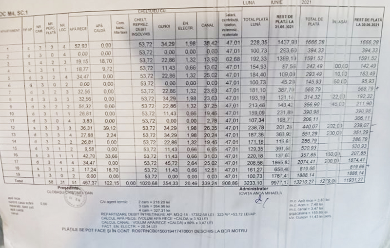 Acest debit se află băgat în cheltuielile pe luna iunie 2021, ceea ce considerăm că nu este legal. Rugăm membrii asociației să facă sesizări, în scris, la președintele asociației și la primărie. Solicităm un audit financiar contabil la această asociație, pentru că sunt o grămadă de nereguli făcute de această doamnă, Ioviță Anca, administrator, economist, casier și probabil jurist – cumul de funcții pe care le permite lege 196/2018 republicată în 2021. CU CÂT AVEM MAI MULTE SESIZĂRI SCRISE VOM REUȘI SĂ ÎNLĂTURĂM NEREGULILE DIN ASOCIAȚIE. UNITATE!”, este mesajul familiei din Motru.