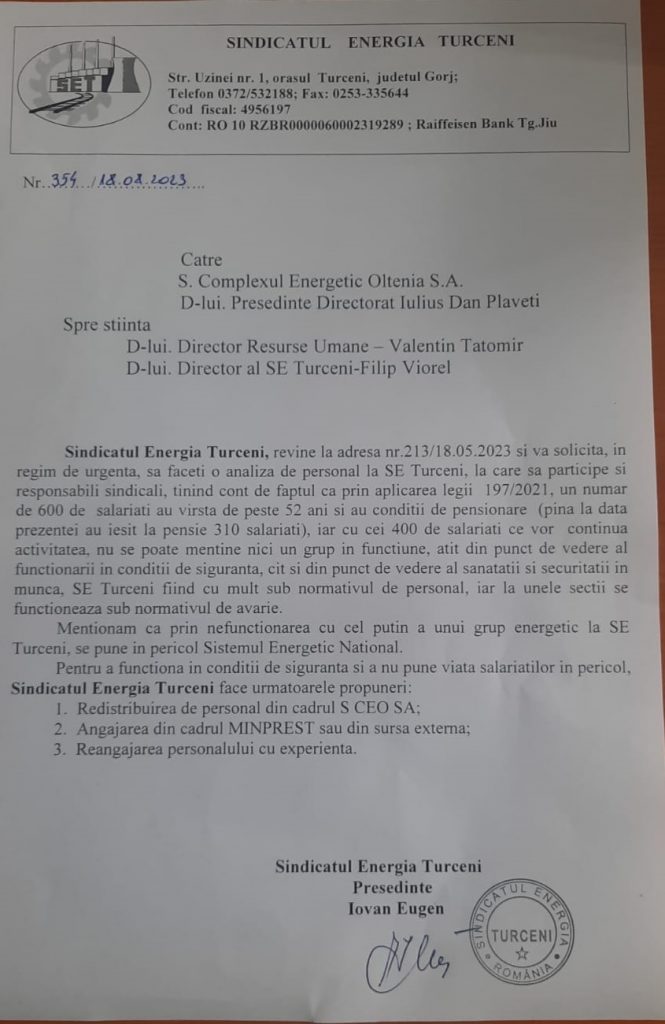 „Menționăm că, prin nefuncționarea cu cel puțin un grup energetic la SE Turceni, se pune în pericol Sistemul Energetic Național. Pentru a funcționa în condiții de siguranță și a nu pune viața salariaților în pericol, Sindicatul Energia Turceni face următoarele propuneri: 1. Redistribuirea de personal din cadrul CEO SA; 2. Angajarea din cadrul MINPREST sau din sursă externă; 3. Reangajarea personalului cu experiență” se arată în adresa semnată de Eugen Iovan.