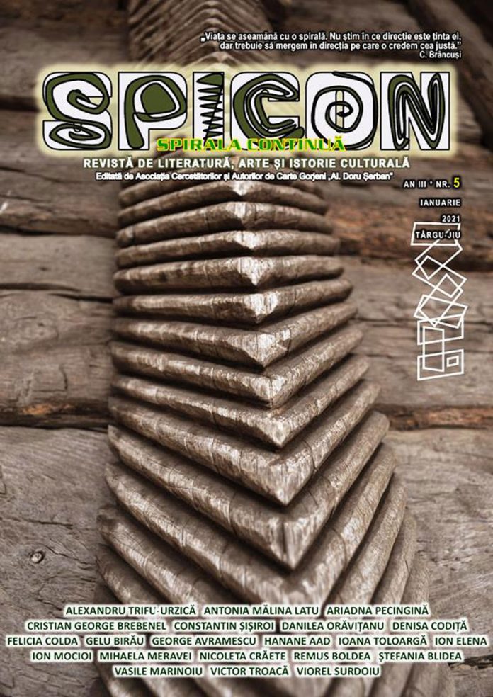 În primele zile ale anului în care tocmai am intrat, ca un semn de bucurie și de prevestire a unui an pe care ni-l dorim a fi, printre altele, și bogat în creații literare, semnalăm apariția ultimului număr al revistei de literatură, arte și istorie culturală ,,Spicon”. Revista este editată prin grija și efortul Asociației Cercetătorilor și Autorilor de Carte Gorjeni ,,Al. Doru Șerban” din Târgu-Jiu. Acest nou număr al revistei apare în formatul său bine cunoscut și găzduiește scrierile unor autori gorjeni cunoscuți, dar și ale unor voci în devenire pe care le apreciem ca fiind de viitor. Totodată, în acest număr își găsesc locul și câteva studii deosebit de interesante referitoare la istoricul unor evenimente, instituții sau personalități.