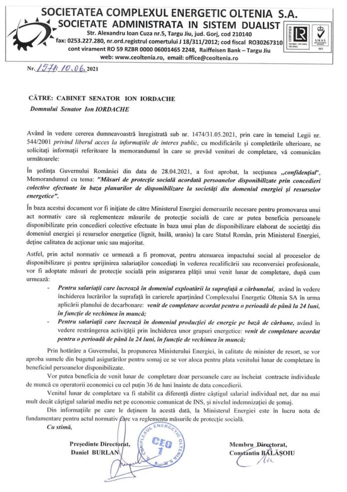 Atașez comunicatului răspunsul primit la solicitarea adresată Complexului Energetic Oltenia! SENATOR ION IORDACHE