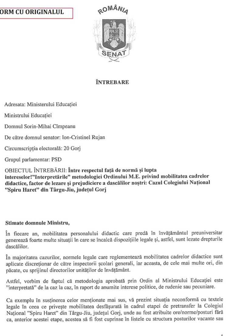Parlamentarul de Gorj a semnalat deficiențe în procedura de mobilitate a cadrelor didactice, iar pentru asta i-a adresat o întrebare, pertinentă, ministrului Educației. În cuprinsul documentului, Rujan îl întreabă pe ministrul Cîmpeanu dacă va realiza controale în școli pe acest aspect, asta deoarece legislația permite ascunderea unor posturi/ catedre și o lipsă de transparență în privința locurilor de muncă vacante din învățământ. Senatorul PSD exemplifică ministrului o situație legata de mobilitatea deficitară chiar de la Colegiul Național Spiru Haret din Târgu-Jiu.