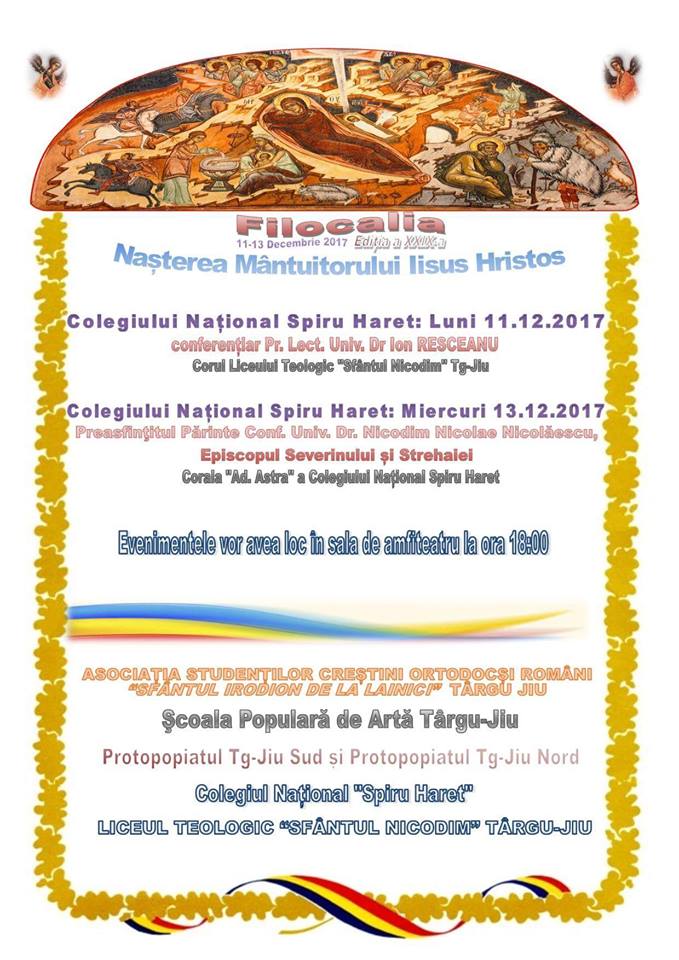 Şcoala Populară de Artă (ŞPA) Târgu Jiu, alături de Asociaţia Studenţilor Creştin – Ortodocşi Români „Sfântul Irodion de la Lainici” Târgu-Jiu, aflată sub patronajul Mitropoliei Olteniei, Protopopiatele Târgu Jiu Nord şi Sud, Colegiul Naţional „Spiru Haret” şi Liceul Teologic „Sfântul Nicodim” Târgu-Jiu organizează în perioada 11 – 13 decembrie, cea de-a XXIX – a ediţie a manifestării religioase „Filocalia”. Evenimentul, desfăşurat în perioada de post şi rugăciune premergătoare marelui praznic al Naşterii Domnului, va fi găzduit în Amfiteatrul Colegiului Naţional „Spiru Haret” din Târgu Jiu, intrarea fiind liberă.