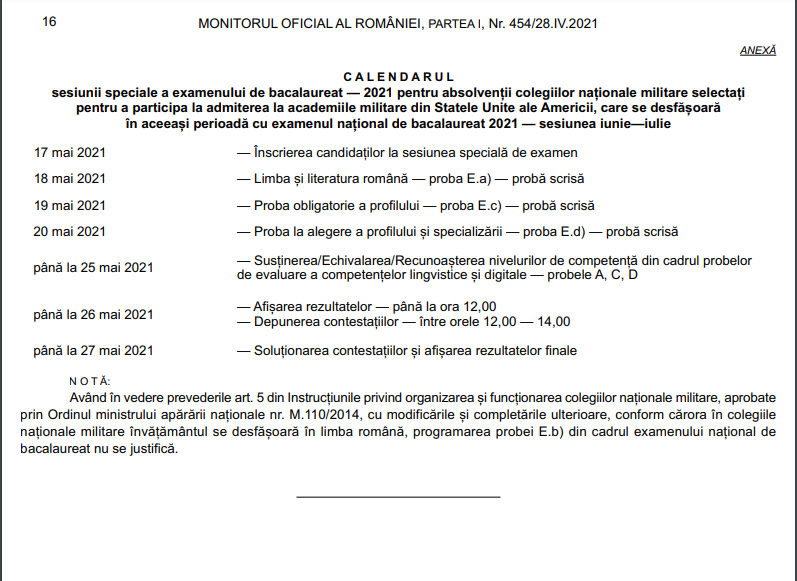 În Monitorul Oficial a fost publicat ieri un Ordin al ministrului educației privind aprobarea calendarului sesiunii speciale a examenului de bacalaureat — 2021 pentru absolvenții colegiilor naționale militare selectați pentru a participa la admiterea la academiile militare din Statele Unite ale Americii, care se desfășoară în aceeași perioadă cu examenul național de bacalaureat 2021 — sesiunea iunie—iulie. Această sesiune se va desfășura în cursul lunii mai, conform următorului calendar:
