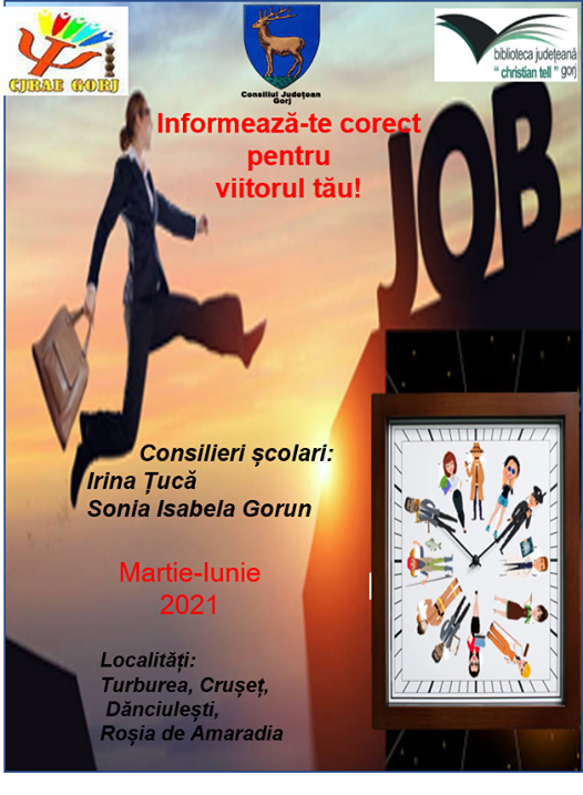 În perioada martie-iunie 2021, Biblioteca Județeană „Christian Tell” Gorj, în parteneriat cu CJRAE Gorj, Liceul Tehnologic Turburea, Primăria, Școala Gimnazială și Biblioteca din Crușeț, Primăria, Biblioteca din Dănciulești și Școala Generală „Cornelius Radu” Rădinești, Primăria, Biblioteca și Liceul Tehnologic Roșia de Amaradia, va desfășura proiectul „Informează-te corect pentru viitorul tău!”. Proiectul este coordonat de Roxana Ungureanu, bibliotecar, și Mădălina Istratie, documentarist CJRAE Gorj, în parteneriat cu bibliotecarii Mădălina Dumitrana, Liviu Dascălu, Ramona Nedelcu și Nicoleta Codreanu și profesorii diriginți Cristian Dascălu, Elena Golumbeanu, Maria Cojocaru, Giorgiana, Lavinia Giulică, Cristiana Ciungu, Iuliana Popa și Eleonora Popa. ”În acest proiect, elevii claselor terminale, în special clasele de a VIII-a, din localitățile Turburea, Crușeț, Dănciulești și Roșia de Amaradia vor fi sfătuiți de către profesorul consilier școlar sociolog Irina Țucă și profesorul consilier școlar psiholog Sonia Isabela Gorun cum să se orienteze către o profesie sau o meserie adaptată personalității fiecăruia și cum să devină mai conștienți cu privire la aptitudinile, interesele și competențele fiecăruia. De asemenea, elevii vor fi îndrumați și informați despre pașii pe care trebuie să-i urmeze fiecare în formarea profesională și despre modul cum se poate face prezentarea și promovarea personală atunci când urmează angajarea: C.V. (curriculum vitae), scrisori de intenție etc. Explorarea profesiilor se va realiza și prin organizarea unor ateliere care vizează cunoașterea profesiilor existente. Aceste ateliere vor fi desfășurate de către profesorii de învățământ primar și preșcolar: Camelia Vlăduțu, Oana Popescu, Eugenia Mărgineanu. Buna desfășurare a proiectului este încurajată și susținută de: Marius Dumitra-Bădescu, primar comuna Dănciulești, Ion Popescu, viceprimar comuna Dănciulești, Liana Marinela Arcuș, director la Școala Gimnazială „Cornelius Radu” Rădinești, Ion Liviu Cotojman, primar comuna Roșia de Amaradia, Teodor Godeanu, primar comuna Crușeț, Maria Irina Godeanu, director la Școala Gimnazială Crușeț, și Liviu Sgaibă, director la Liceul Tehnologic Turburea”, au anunțat reprezentanții Bibliotecii Județene ”Christian Tell” Gorj.