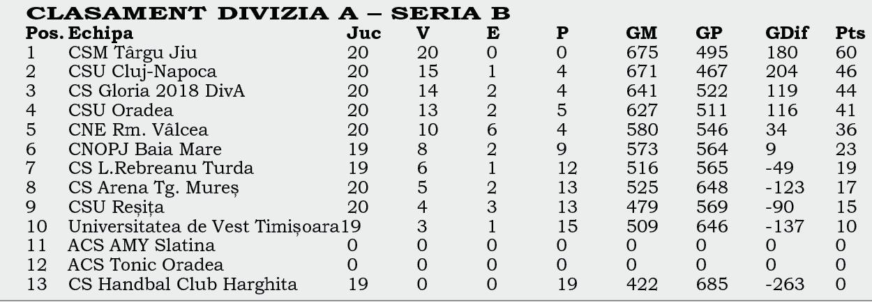 Principala echipă de handbal de la CSM Târgu Jiu a promovat, cu stil, în Liga Florilor. Fetele pregătite de Liviu Andrieş şi Andrei Enache s-au impus şi în ultima etapă a Seriei B din Divizia A, 23-36 (11-17), pe terenul formaţiei CSU Reşiţa. A fost victoria cu numărul 20, din tot atâtea încleştări, iar fetele vor intra acum într-o binemeritată vacanţă.