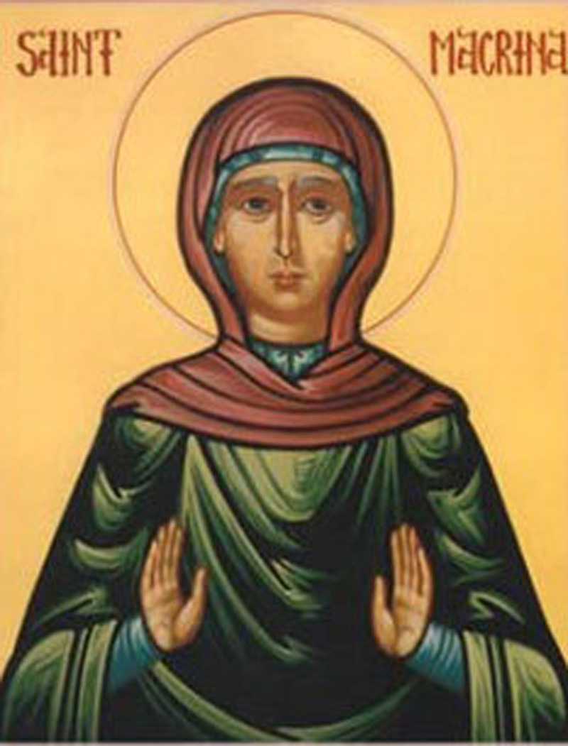 zece copii ai acestei familii de sfinți. La nașterea ei (anul 327), un personaj misterios i-a apărut în trei rânduri mamei ei, poruncindu-i să dea copilei numele de Tecla, prima muceniță și modelul fecioarelor creștine Dar mama ei a păstrat secret acest nume și a dat copilei numele bunicii ei, Macrina cea Bătrână. Această sfântă, fiind împodobită cu frumusețea trupului și de neam bun, a fost logodită după un mire asemenea ei. Și numai cât se logodiră, logodnicului ei, prin locuri străine, i s-a întâmplat moarte. Iar fericita Macrina, vrând alții mulți să o ia de soție, și-a ales văduvia, cu nimic ispitind-o dulceața nunții. De aceea, osebindu-se de toată împreunarea lumească, trăia cu maica sa, silindu-se și nevoindu-se cu dumnezeieștile Scripturi, și hrănind, ca o a doua mamă, pe cei ce erau născuți după dânsa, frați și surori. Căci, fiind de toți zece prunci, ea era mai mare!