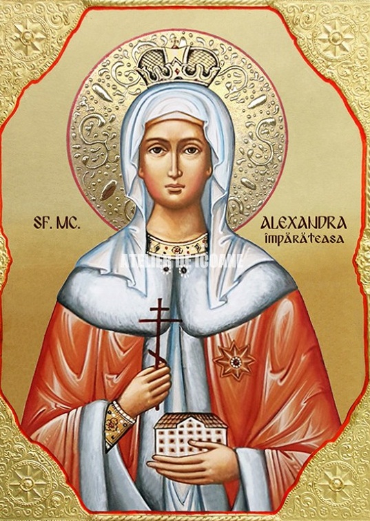 Aflând Alexandra această hotărâre a împăratului, în închisoare s-a rugat lui Dumnezeu și și-a dat sufletul! Atunci, Apolo, Isachie și Codrat, slugile împărătesei Alexandra, văzând-o pe ea că a disprețuit împărăția și că, prin credinţa în Hristos, a și murit pentru El, au mers pe numele muceniței și au crezut și ei în Hristos. Înfățișându-se la împărat, l-au mustrat pe acesta, numindu-l călcător de lege și sălbatic, și că nu i-a fost milă de însăși femeia sa, cu care a făcut copii. Împăratul s-a supărat și a poruncit să le bage în închisoare pe cele trei slugi credincioase Alexandrei, sperând că vor muri de teamă la gândul chinurilor la care vor fi supuse. Dimineața, scoțându-i din temniță, pentru Codrat a poruncit să fie tăiat, iar Apolo și Isachie, iarăși să fie băgați la închisoare și lăsați să moară de foame. După câteva zile de foamete, cei doi au murit! Sfânta Mare Mucenică Împărăteasa Alexandra a fost un exemplu de dragoste pentru Dumnezeu și evlavie, deși era soția împăratului Dioclețian, cel cunoscut în istorie pentru dispoziția sa crudă, opresor și persecutor al creștinilor. Mucenicul împărătesc a fost punctul central al tuturor virtuților feminine, o soție credincioasă, dar dragostea ei pentru Dumnezeu era mai presus de toate, chiar și riscul de a fi prinsă în credința creștină și de a pieri nu a oprit-o nicicum! Numele sfintei mari mucenice împărăteasa Alexandra este slăvit pentru faptul că sfânta nu s-a temut, la aflarea exploatării Sfântului Gheorghe Victorios, să vină la locul procesului sfântului și să depună mărturie deschisă despre aceeași credință cu el în fața soțului ei, crudul persecutor al creștinilor, Dioclețian. Rugăciunea către ea în fața sfintei sale icoane, se spune că ne va proteja de orice rău şi să ne rugăm ei pentru mântuirea sufletului, precum și pentru protecție împotriva unei posibile trădări. De asemenea, i se cere să salveze relațiile de familie și unitatea spirituală în căsătorie. Rugăciunea în fața icoanei Sfintei Mari Mucenice Împărăteasa Alexandra ajută la întărirea spiritului, exemplul ei de mărturie deschisă a credinței lui Hristos, pe care a arătat-o, pregătindu-se pentru execuție împreună cu Sfântul Mare Mucenic Gheorghe Învingătorul, fără a ceda cu curaj în fața unui om, ajută la găsirea forței spirituale în sine când sunt gata unii să te părăsească. Împărăteasa-Mare Mucenică Alexandra este rugată pentru mântuirea sufletului și eliberarea de orice răutate. Numele Alexandru şi Alexandra sunt de origine greacă (Alexandros) și însemna cel care apără poporul, oamenii. Alexandru este format din cuvintele „alexo” care înseamnă „a apăra”, „a proteja”, și „andros” care înseamnă „bărbat”, „om”. Așadar, „La Mulți Ani” pe cei care poartă numele Alexandru, Alexandra, Alex, Al, Alessia, Alecu, Lexi, Lixandru, Lixandra, Lisandru, Lisandra, Șandru, Sandra, Alexandrina, Sandrina, Sandu, Sanda, Săndel, Sănducu, Ducu, Duțu, Saşa, Alessandra.