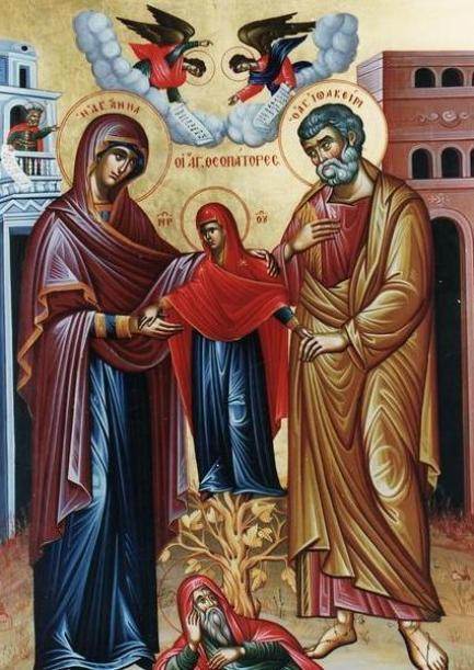 În legătură cu Sfinții Drepții și Dumnezeieștii Părinți ai Maicii Domnului, putem spune: Ioachim cobora din vestitul neam al lui David, iar Ana era una dintre fiicele lui Levi, adică de neam preoțesc. Levi a avut trei fete: pe Ana, mama Mariei, pe Elisabeta, mama lui Ioan Botezatorul, și pe Salomeea, mama fiilor lui Zevedei. Ei erau drepți înaintea lui Dumnezeu și la fiecare sărbatoare luau două părți din căștigul lor, o parte o dădeau săracilor, iar pe cealaltă o dădeau lui Dumnezeu.
