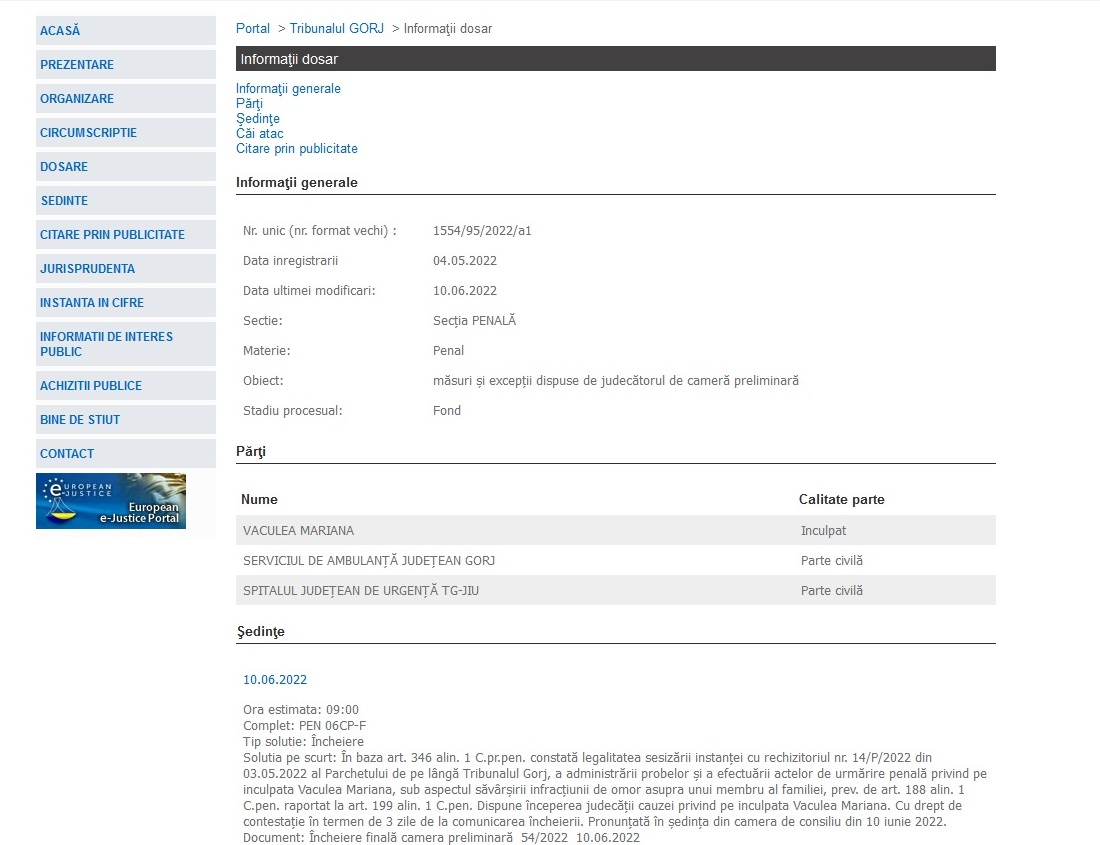 Mariana Vaculea a fost trimisă în judecată, în stare de arest preventiv, pentru omor asupra unui membru al familiei. Tribunalul Gorj a admis, pe 10 iunie, rechizitoriul procurorilor și a dispus începerea judecății.