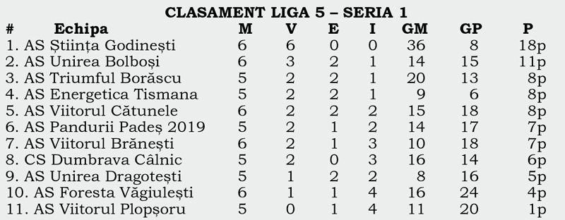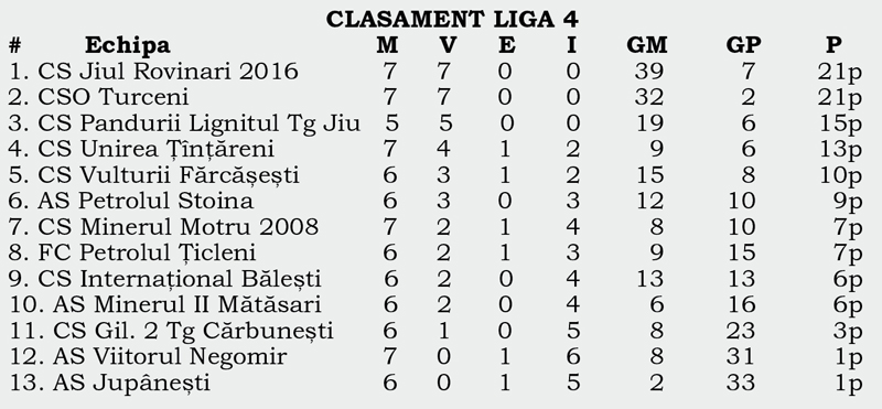 Pandurii Târgu Jiu nu va mai juca în Liga 4, iar AJF Gorj va oficializa retragerea echipei din municipiu în cel mai scurt timp. După abandonul forțat al târgujienilor, două formații au rămas cu bilanț perfect în eșalonul superior de la județ. CSO Turceni și Jiul Rovinari au obținut succese concludente și în această rundă și s-au detașat de pluton. Au fost din nou meciuri cu multe goluri și la Liga 5, acolo unde Ştiința Godinești rămâne singura echipă neînvinsă din cele două serii.