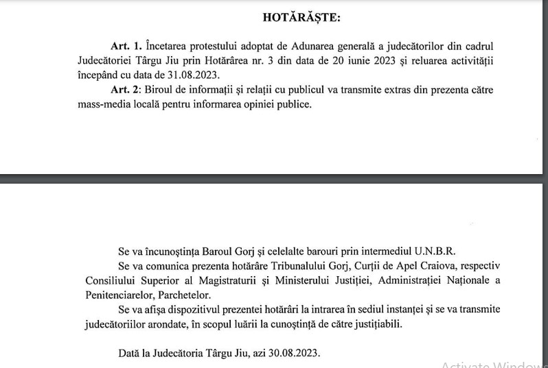 „Adunarea Generală a Judecătorilor Judecătoriei Târgu Jiu, întrunită în şedinţa din 30 august 2023, la convocarea judecătorului delegat în funcţia de vicepreşedinte, în prezenţa a 18 judecători din totalul de 23, a hotărât, cu majoritate, încetarea protestului adoptat de Adunarea generală a judecătorilor din cadrul Judecătoriei Târgu Jiu prin Hotărârea nr. 3 din data de 20 iunie 2023 şi reluarea activităţii începând cu data de 31.08.2023”, a informat Judecătoria Târgu Jiu.