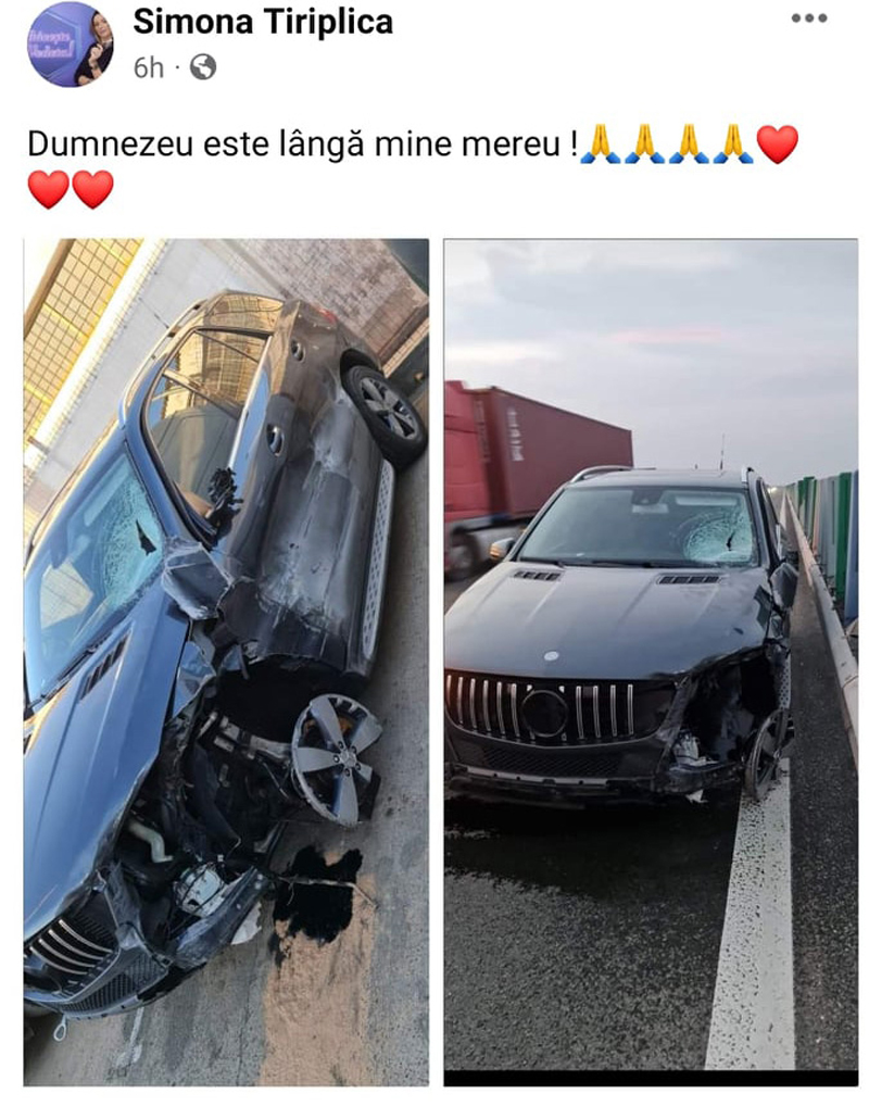 Mesajul care însoțește fotografiile este: ,,Dumnezeu este lângă mine mereu”, arătând astfel că este bine și a scăpat nevătămată din evenimentul rutier respectiv. Bolidul Mercedes este însă grav avariat pe partea șoferului, având partea din față stânga distrusă, fără far, dar și cu roata aproape lipsă.