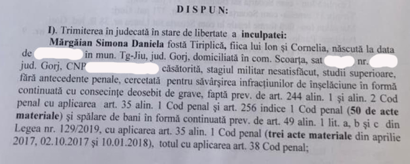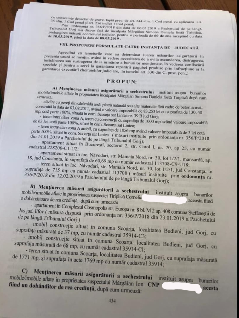 În rechizitoriul care are 457 de pagini, procurorul de caz Andrei Cristian Onescu a trecut toate etapele acestei anchete penale laborioase, desfășurată pe teritoriul a două țări, România și Italia. De altfel, pe timpul anchetei penale s-a pus sechestru asigurator pe vila de piatră din Scoarța a Simonei Mărgăian, pe două parcele de teren din satul Lintea, pe un apartament din București și pe unul din Năvodari. De asemenea, pe un teren din Năvodari.