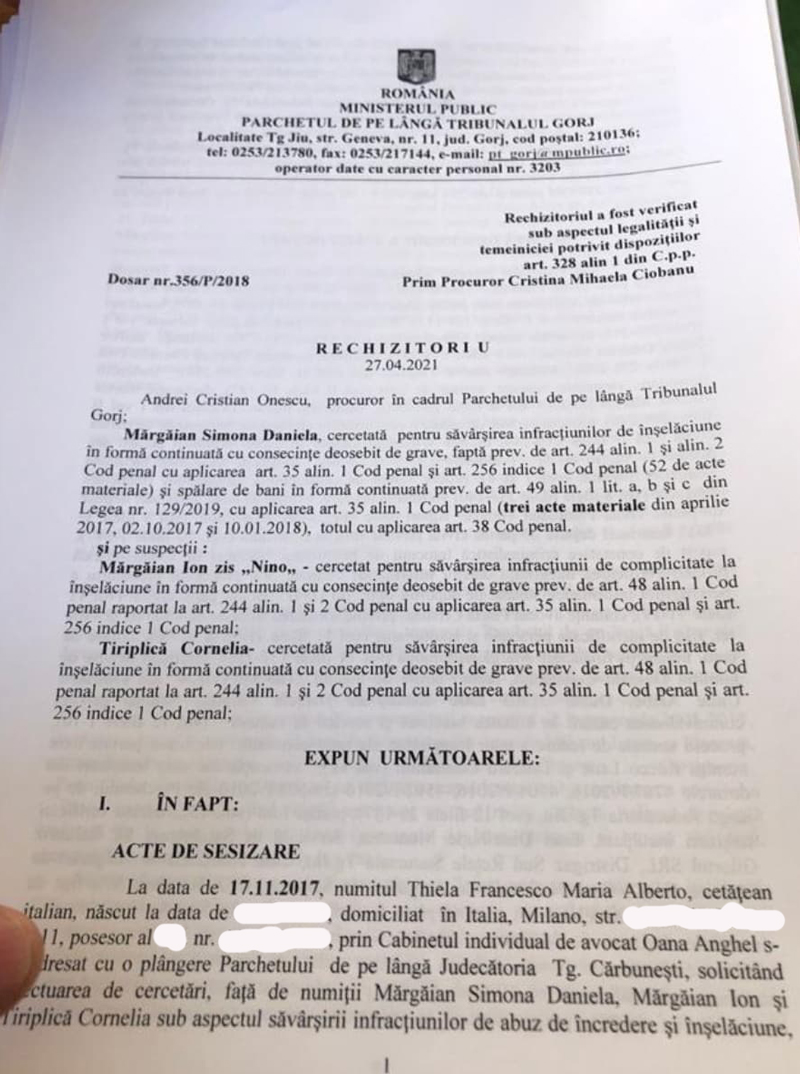 care i-a fost adus părții civile, italianului ajuns la sapă de lemn. Francesco Thiella a cunoscut-o pe Simona Mărgăian într-un club de noapte unde fetele dansau pentru clienți pe jumătate dezbrăcate, povestea italianul care a acuzat că gorjeanca l-a escrocat sentimental în perioada 2015-2017, făcându-l să își vândă apartamentul din Milano, să îi ofere bijuteriile soției defuncte, să ii cumpere o mașină și să îi plătească o excursie în Dubai și o afacere așa-zis ,,eșuată” în Emiratele Arabe. La revenirea în țară, Simona Mărgăian îi cerea bani italianului pentru lemne și pentru diverse boli inventate pentru părinții săi.
