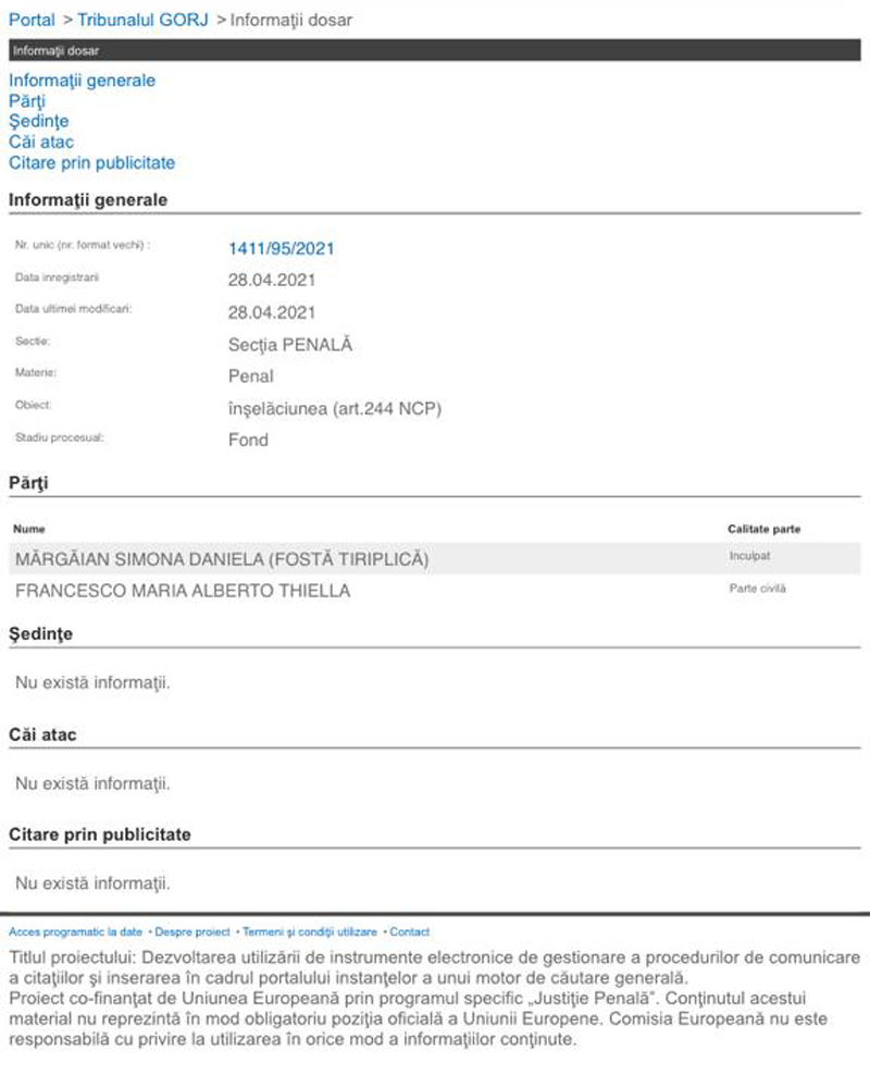 Pe data de 27 aprilie, la trei ani și cinci luni de la depunerea plângerii penale a italianului Francesco Thiella, gorjeanca Simona Mărgăian a fost trimisă în judecată pentru înșelăciune în formă continuată cu consecințe deosebit de grave, cu 50 de acte materiale, și spălare de bani în formă continuată, cu 3 acte materiale, de către Parchetul de pe lângă Tribunalul Gorj. Averea Simonei Mărgăian, a soțului și a părinților săi rămâne sub sechestru pe timpul judecății cauzei, dosarul fiind înregistrat pe data de 28 aprilie 2021 la Tribunalul Gorj, blonda de la Scoarța, acuzată de escrocarea septuagenarul italian cu peste 780.000 de euro, având calitatea de inculpat. Soțul acesteia, Nino Mărgăian, și mama ei, Tiriplică Cornelia, au fost scoși de sub acuzarea de complicitate la înșelăciune în formă continuată cu consecințe deosebit de grave.