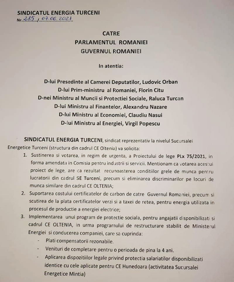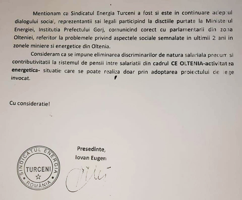 Ieri, şi Sindicatul Liber Turceni, condus de Eugen Iovan, cu 1.220 de membri, s-a alăturat celorlalte: Sindicatul Lignitul Oltenia, Solidaritatea 2013, Energia Rovinari, Renaşterea Jilţ, sindicatele de la Husnicioara, Craiova II şi Işalniţa.