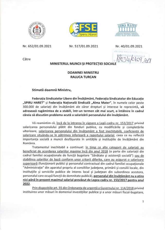 „Federaţia Sindicatelor Libere din învățământ, Federația Sindicatelor din Educație „SPIRU HARET” și Federația Națională Sindicală „Alma Mater”, în numele celor peste 300.000 de salariați din învățământ ale căror drepturi și interese le reprezintă, vă adresează rugămintea de a stabili, într-un termen cât mai scurt, o întâlnire în cadrul căreia să discutăm problema acută a salarizării personalului din învățământ. Vă reamintim că, încă de la intrarea în vigoare a Legii-cadru nr. 153/2017 privind salarizarea personalului plătit din fonduri publice, cu modificările și completările ulterioare, salarizarea personalului din învățământ a fost inechitabilă, coeficienții de salarizare situându-se în pătrimea inferioară a raportului salarial, ceea ce nu reflectă importanța socială a muncii desfăşurate în unitățile şi instituţiile de învățământ din România.