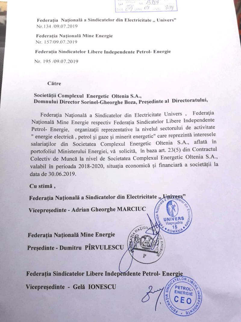 Semnatarii scrisorii îi solicită astfel premierului numirea unei comisii la nivelul Guvernului României, care să găsească soluțiile necesare asigurării stabilității economico-financiare a Complexului Energetic Oltenia, care, în opinia acestora, se degradează iremediabil. Liderii se pun, de asemenea, la dispoziția premierului Dăncilă, căreia îi solicită o întâlnire necesară pentru bunul mers al CEO.,,Contradicțiile din Proiectul Strategiei Energetice și mesajele transmise de conducerea Ministerului Energiei destabilizează pacea socială în rândul salariaților care merită siguranța locurilor de munca după eforturile depuse pentru asigurarea siguranței în funcționare a Sistemului Energetic Național. Decarbonizarea nu înseamnă, doamnă Prim-Ministru, renunțarea la combustubilul fosil (cărbune) pentru producerea energiei electrice. Am adaptat ca și companie, tehnologii care să nu mai polueze, modernizând agregatele din centralele electrice, astfel încât ne-am încadrat în parametrii necesari pentru a obține acordurile de mediu pentru cele patru termocentrale din portofoliul companiei. Vă asigurăm, doamnă Prim-Ministru, de tot sprijinul nostru în vederea găsirii celor mai bune soluții care să protejeze interesele strategice ale statului român și vă solicităm o întâlnire, cât mai repede cu putință pentru a asigura continuarea activității în condiții de eficientă a Complexului Energetic Oltenia”, se subliniază în document. Printr-o adresă, cele trei Federații din CEO cer și situația financiară a societății. Sindicatele nu au anunțat acțiuni de protest, în perioada imediat următoare, așa cum, recent, mai mulți lideri declarau în mass-media.