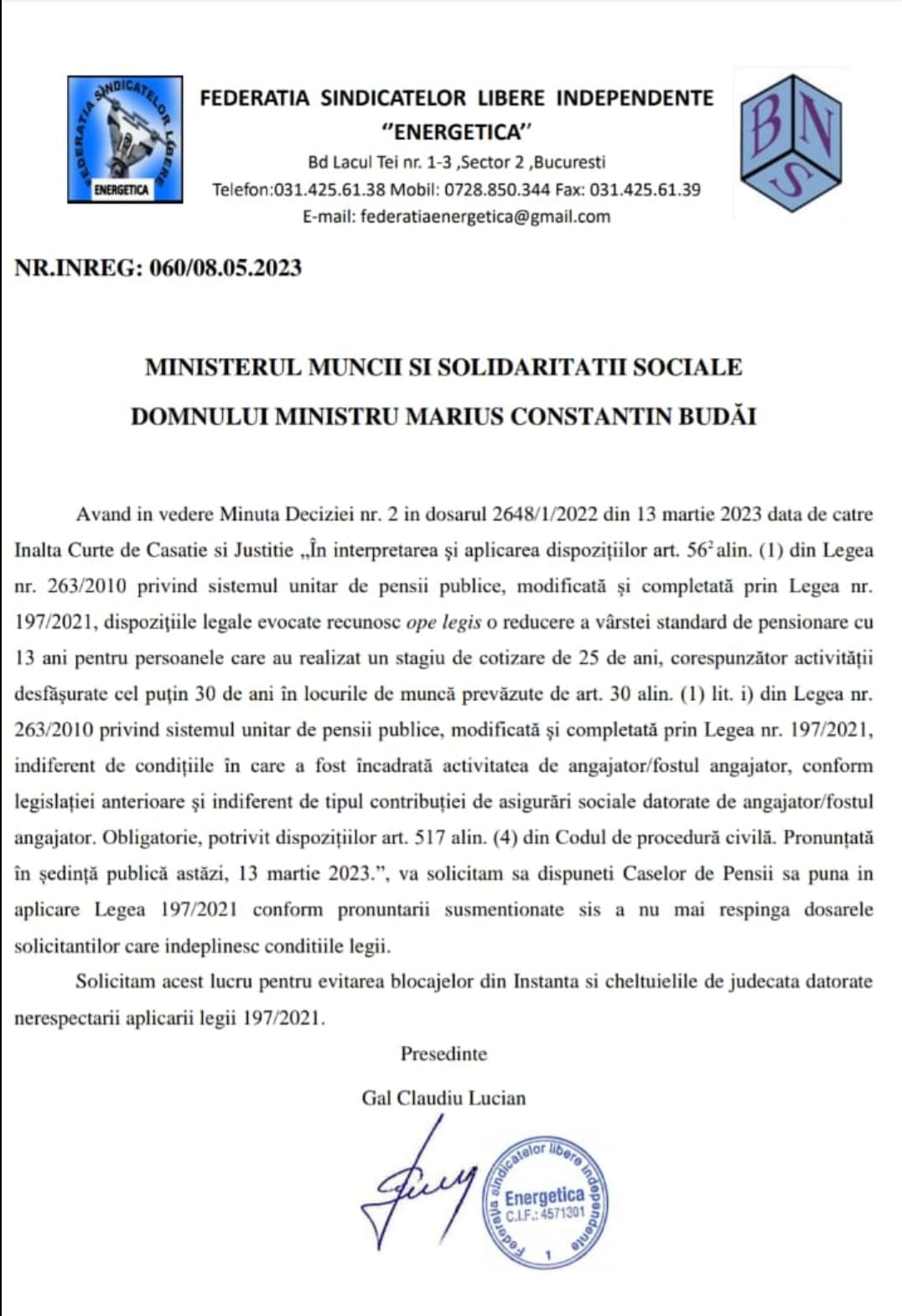 Având in vedere tergiversarea aplicarii Legii 197/2023, FARĂ NICIO JUSTIFICARE LEGALĂ SAU MACAR LOGICĂ, mai ales acum, după Decizia din 13 martie a.c. a ICCJ, presedintele Sindicatului TERMO ENERGIA Criaiova ll – Vasile Cristian a solicitat Federatiei Energetica emiterea unei petiții catre MINISTERUL MUNCII SI SOLIDARITATII SOCIALE, in speță dlui Ministru Budai, prin care se solicită punerea de indată in aplicare a Legii 197/ 2021!