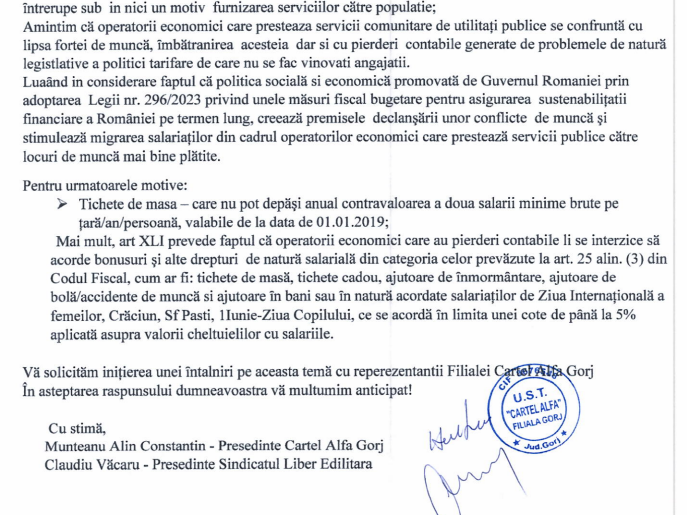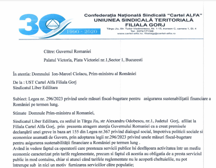 Sindicatul Cartel Alfa cere o întâlnire cu guvernul pentru situația de la Edilitara