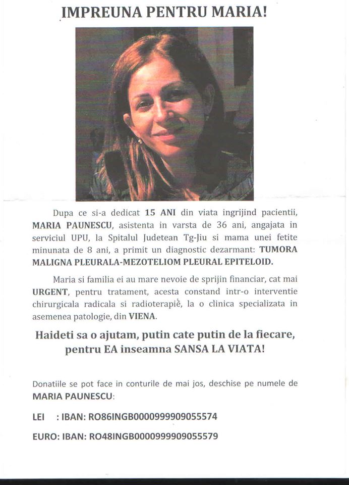 ,,Avand în vedere campania umanitară de strangere de fonduri pentru colega noastra, asistenta medicala, Maria Paunescu, chiar daca nu este membra a organizatiei noastre, SINDICATUL SANATATEA GORJ, doneaza suma de 1000 lei. Invit si celelalte sindicate din sistemul sanitar, si nu numai, sa o ajute pe Maria”, a transmis Ion Măruță, liderul de sindicat de la Dobrița.