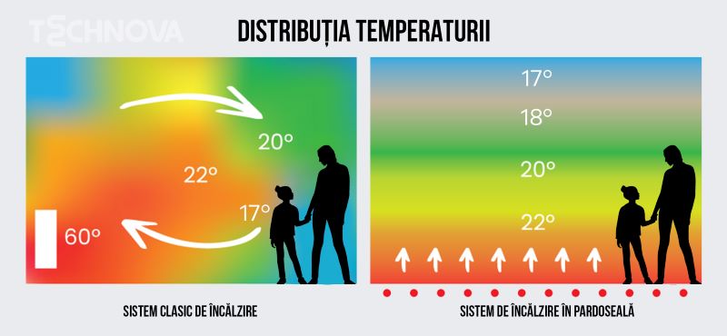 1. Distribuție uniformă a căldurii: Sistemele de încălzire în pardoseală asigură confort termic întregului spațiu, fără a exista puncte calde sau puncte reci. Căldura este distribuită uniform în încăpere, asigurând constant o temperatură adecvată;