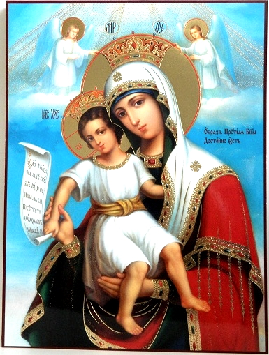 ,,Preacurată Doamnă Stăpână, de Dumnezeu Născătoare Fecioară, care poți face tot binele, primește aceste cinstite daruri, care se cuvin numai ție, de la noi nevrednicii robii tăi, Ceea ce ești aleasă din toate neamurile și te-ai arătat mai înaltă decât toate făpturile cerești și pământești. Căci pentru tine a fost cu noi Domnul puterilor și prin tine am cunoscut pe Fiul lui Dumnezeu și ne-am învrednicit de Sfântul Trup și de Preacuratul Lui Sânge. Pentru aceasta fericită ești în neamurile neamurilor, ceea ce ești de Dumnezeu fericită, mai luminată decât heruvimii și mai cinstită decât serafimii…Și acum, Preasfântă Stăpână de Dumnezeu Născătoare Fecioară, întru tot lăudată, nu înceta a te ruga pentru noi, nevrednicii robii tăi, ca să ne izbăvim de sfatul celui înșelător și de toată primejdia, și să fim păziți nevătămați de toată lovirea cea înveninată a diavolului; ci până în sfârșit cu rugăciunile tale păzește-ne pe noi neosândiți. Ca prin paza și cu ajutorul tău fiind mântuiți, slavă, laudă, mulțumită și închinăciune, pentru toate să înălțăm, Unuia în Treime Dumnezeu, Ziditorul tuturor, acum și pururea și în vecii vecilor. Amin”.
