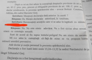-Plângerea mamei minorului, tot pe 1 iunie la IPJ Gorj. În aceiași zi, se întocmesc: declarația minorului, declarația mamei și ordonanța procurorului de incepere a urmăririi penale și de interceptare a telefonului polițistului.